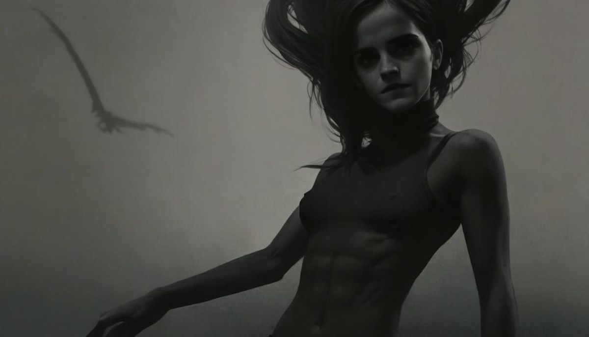 This image depicts a gothic-style portrait of a woman with pale skin. The subject has a fitness-oriented physique, rendered in a dark and moody aesthetic.