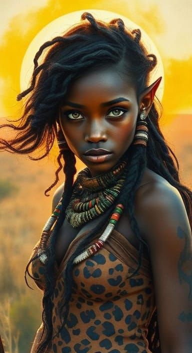 A close-up portrait of a beautiful Masai warrior elf in a leopard print dress, holding a spear, set against an African savanna backdrop. The art style evokes impressionist paintings with thick brush strokes.