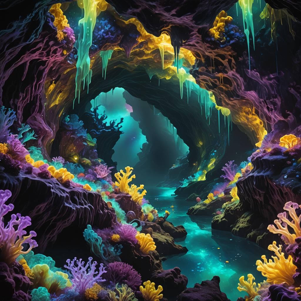 This image shows a network of bioluminescent caves deep in the ocean. Serpentine chemosynthetic creatures line the iridescent tunnels, with deep blues and purples contrasting vibrant greens and yellows, in a vibrant aquatic fantasy.