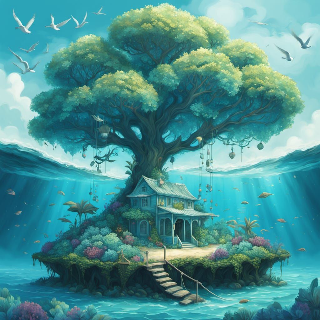 A whimsical image shows a man constructing a model city beneath a sea grape tree, with soft blue flames and gentle ocean waves. The artwork has a romanticized fantasy aesthetic.