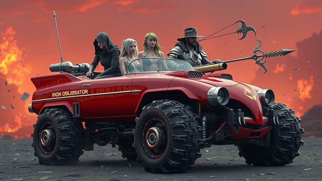 This image depicts four female adventurers sitting atop a heavily modified war machine in a hellish landscape, amidst flames and ash. The intricate mechanical details of the vehicle shine in the fiery light, while the adventurers showcase their unique abilities and styles.