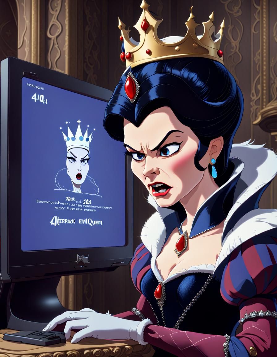 This image shows the Evil Queen from Snow White gazing at a wall-mounted flat screen monitor. The monitor displays a 404 error message in a glitchcore aesthetic, rendered in a cel-shaded Disney style.