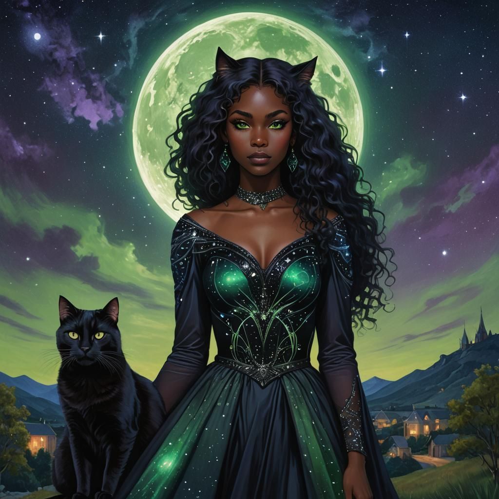 A striking picture of a Black woman in a gown standing next to a big black cat in a nocturnal fantasy scene. Both have mesmerizing green eyes, illuminated by a soft, moonlit glow and a starlit sky in an Art Nouveau style.