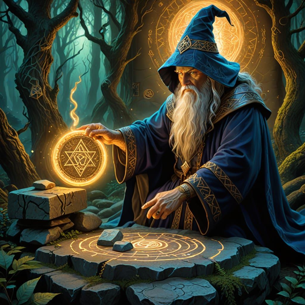 This highly detailed digital painting depicts a wizard studying glowing runes etched into stone, surrounded by mystical energy in a deep forest. Concept art with dramatic lighting.