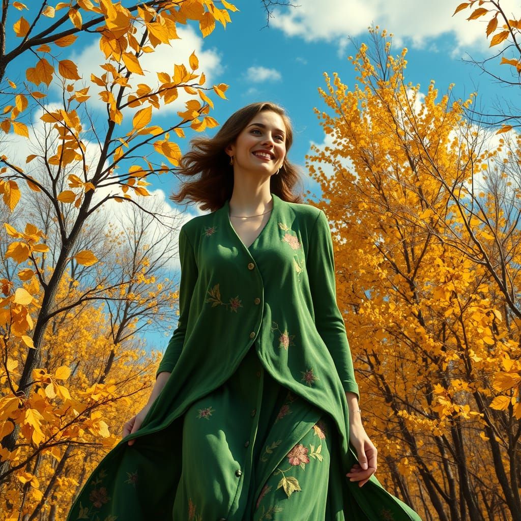This image depicts a serene autumn forest scene featuring a refined woman in green velvet, surrounded by golden maple leaves and gnarled oak branches, set against a soft blue sky with fluffy clouds.