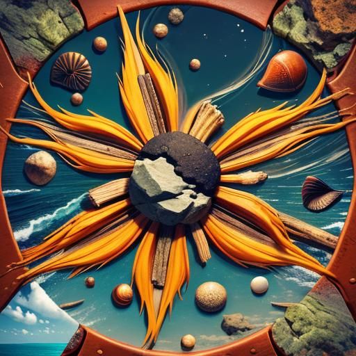 A scenic view of a sunlit beach with gentle waves. The image features a mix of natural elements, including seashells, driftwood, and sandstone cliffs under a cloudy sky.