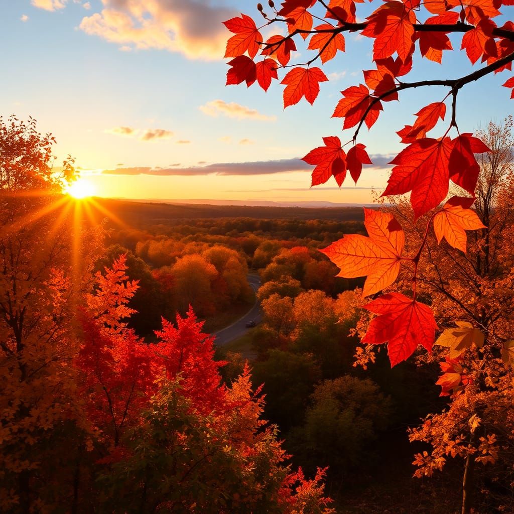 This image shows a vibrant autumn sunset over a national park. Golden, red, green, and orange leaves create a warm and inviting scene in this colorful landscape image.