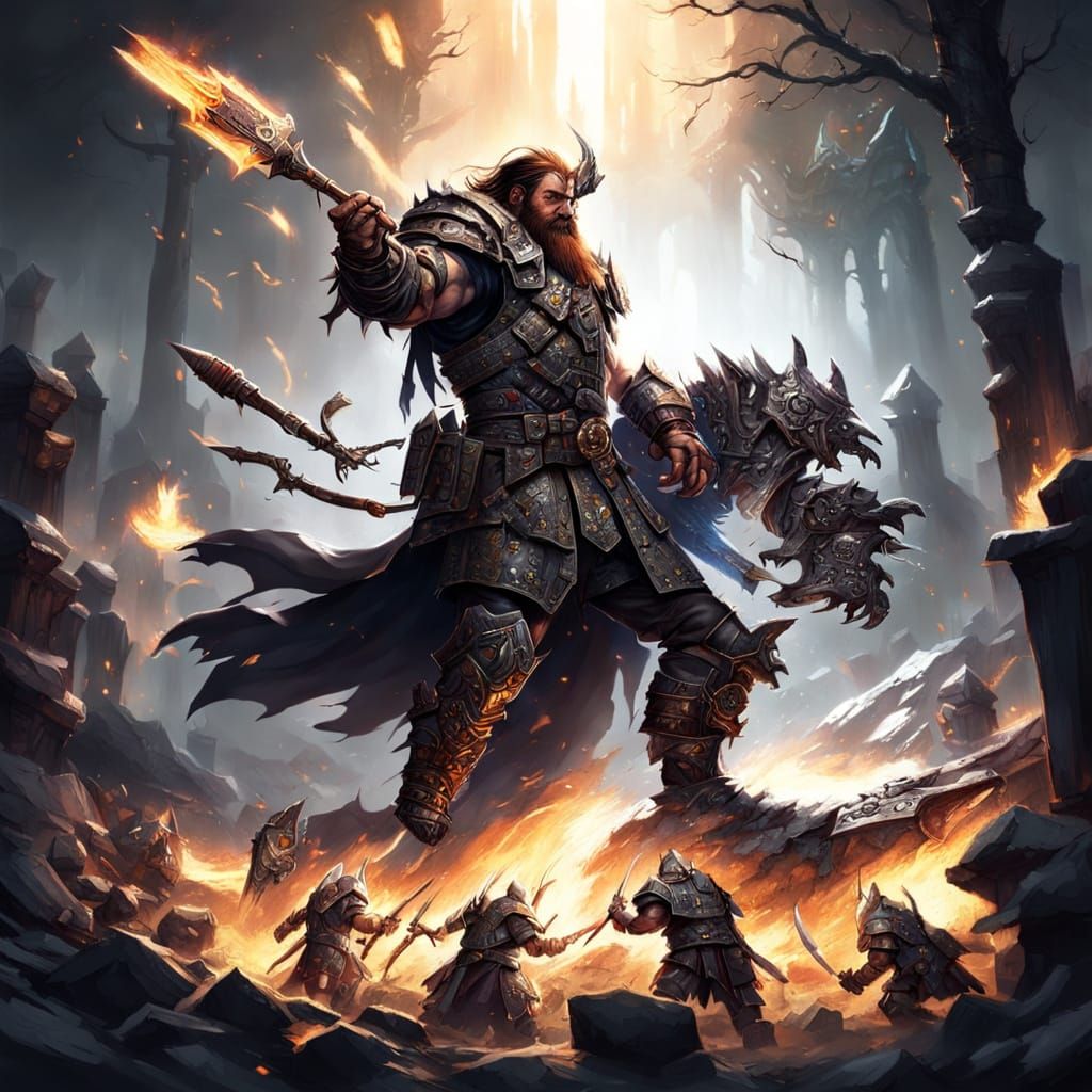 A close-up image of a dwarf blacksmith wizard wielding a warhammer. The fantasy art features cinematic and dynamic lighting, leather armor, and detailed textures in a mystical atmosphere.