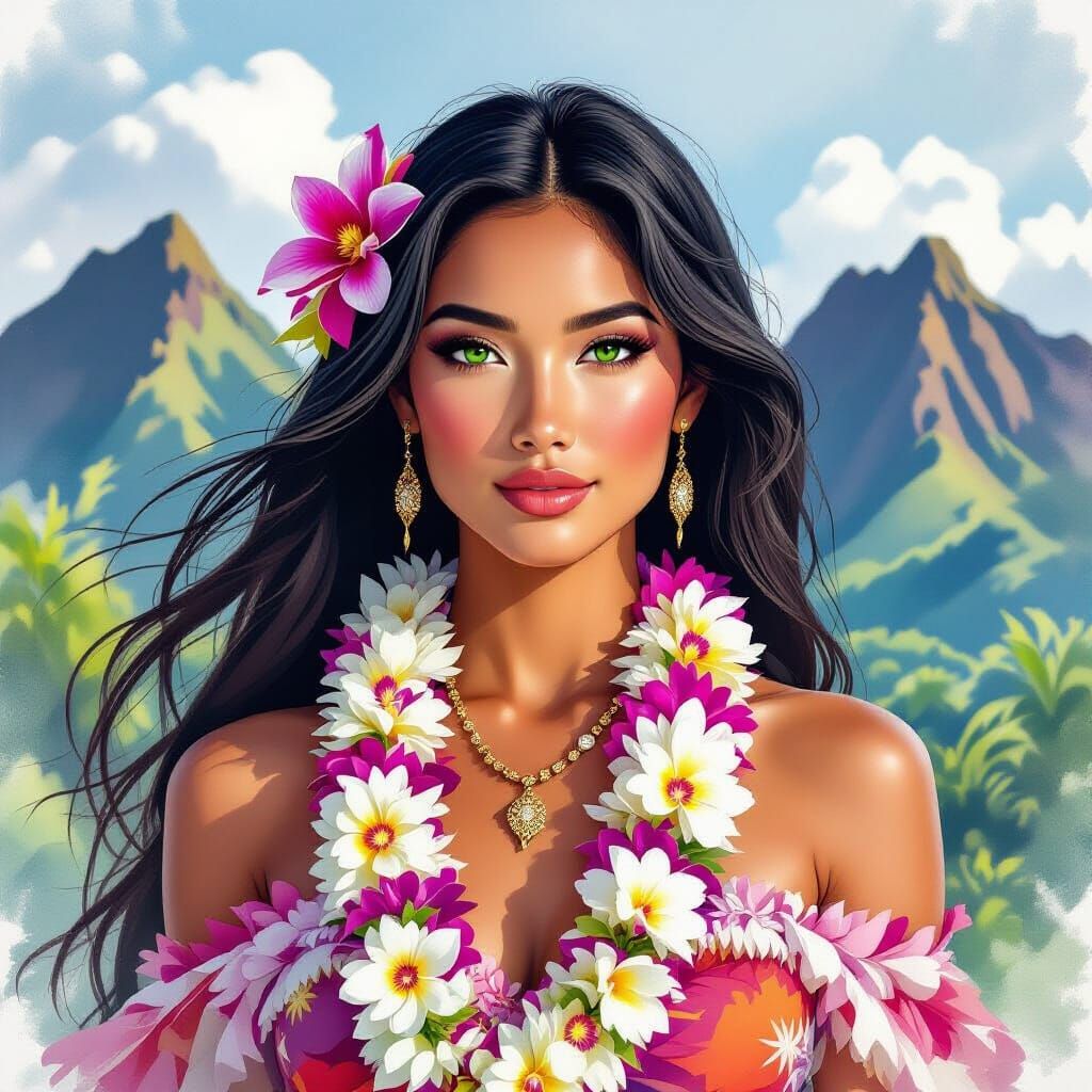 A striking picture of a Hawaiian goddess adorned with an orchid lei, set against volcanic mountains. The image blends realism and dreamlike surrealism in a watercolor and alcohol ink aesthetic.