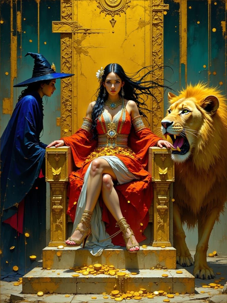 This image depicts a regal Native American woman on a throne, guarded by a lion and observed by a witch. It features dramatic lighting and rich colors in an epic fantasy digital painting style.