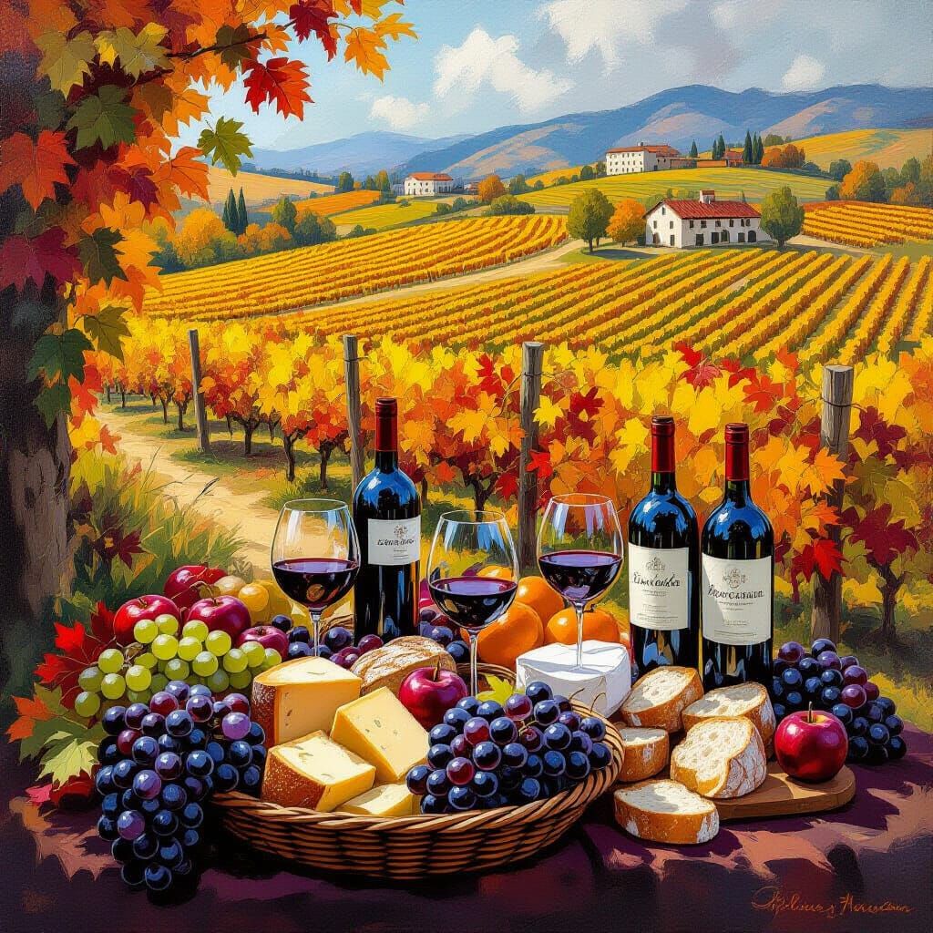 This image showcases a bacchanalian buffet in Napa's autumn winery, featuring ecstatic fall colors, grapes, wine, and seasonal produce, rich and vibrant.