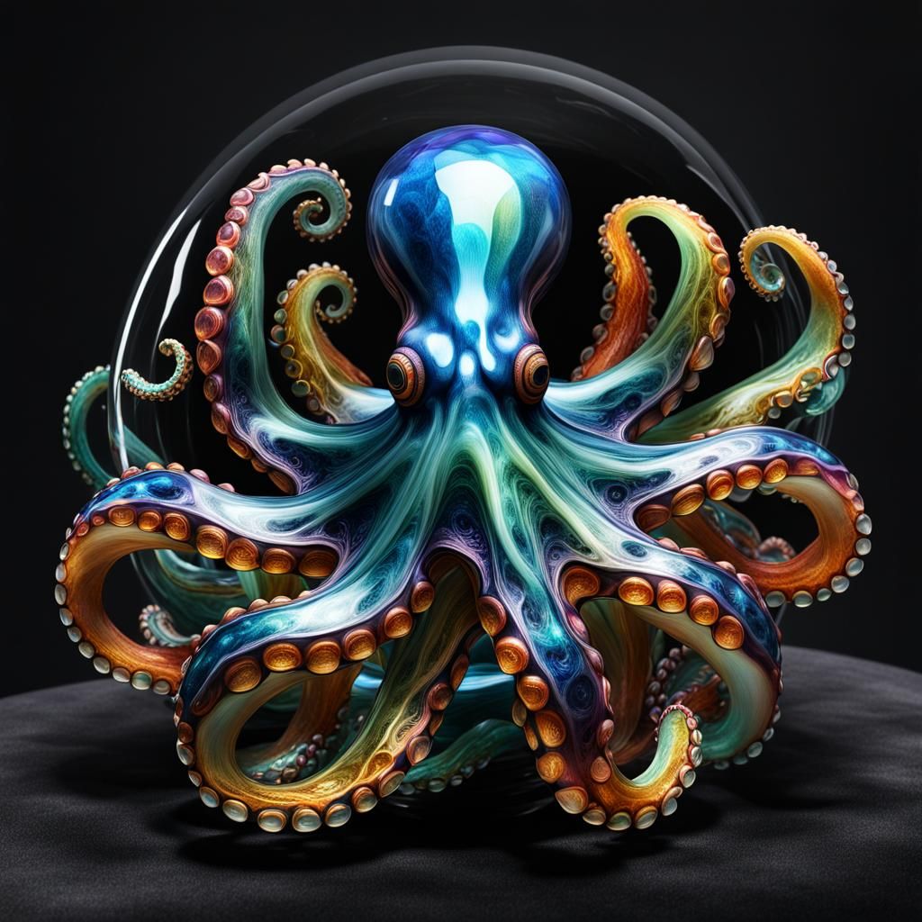 A stunning image of a vibrant glass octopus displayed on black velvet. The artwork is rendered with incredible detail and complexity, creating an elegant and iridescent effect.