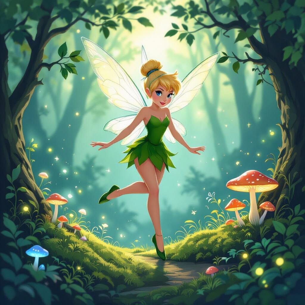 This image depicts Tinkerbell, the beloved fairy, in a whimsical forest setting. The artwork captures her playful spirit and magical aura.