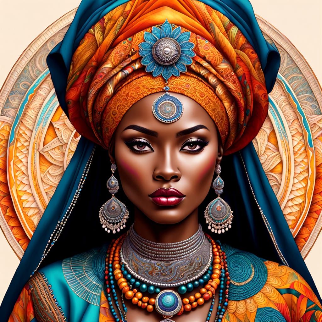 A striking picture of a Yoruba woman in detailed colorful clothing and futuristic jewelry. The image features psychedelic mandala elements painted on parchment, in a surreal aesthetic.