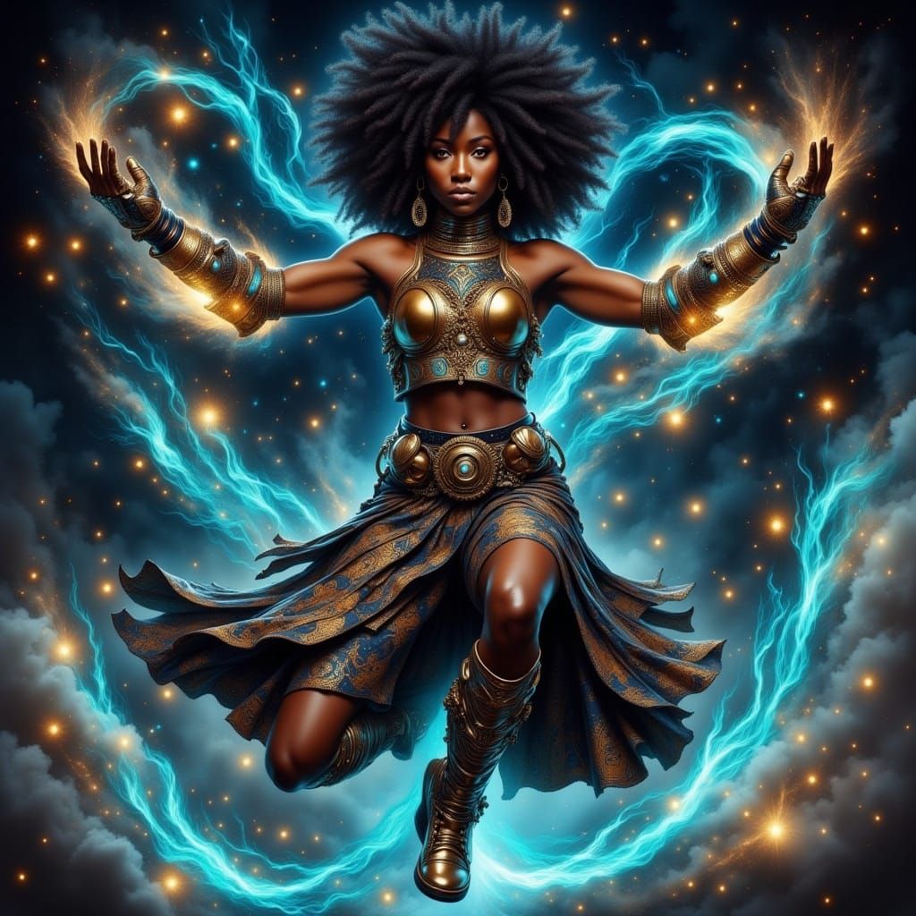 A powerful Nigerian warrior with dark skin and neon yellow eyes, adorned with metallic beads and African-inspired patterns, prepares for a high-speed leap surrounded by a whirlwind of glowing energy.