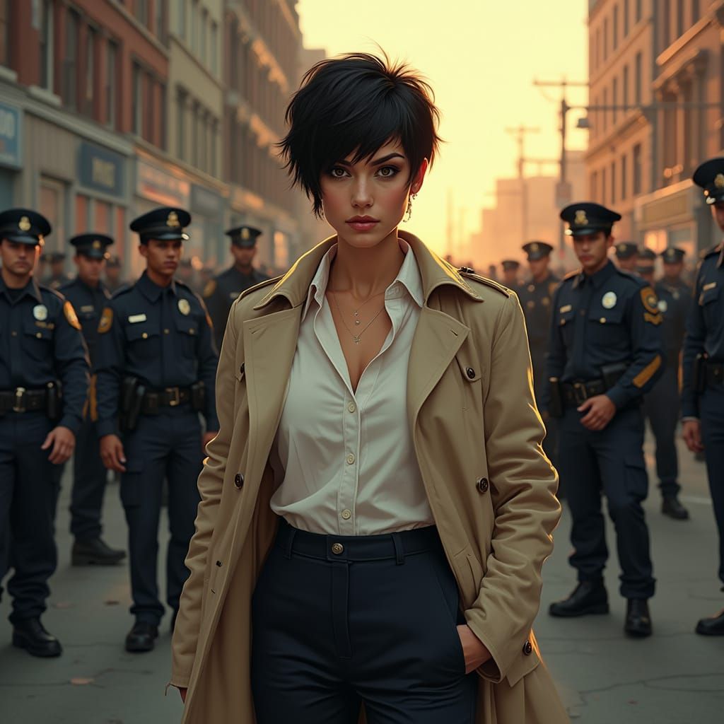 This image shows a striking portrait of a woman standing near a worn police barricade in Boston's Combat Zone, exuding confidence and poise in the warm light of dusk. Rendered in a vibrant, hyper-realistic style, the scene blends cinematic quality with gritty urban texture.