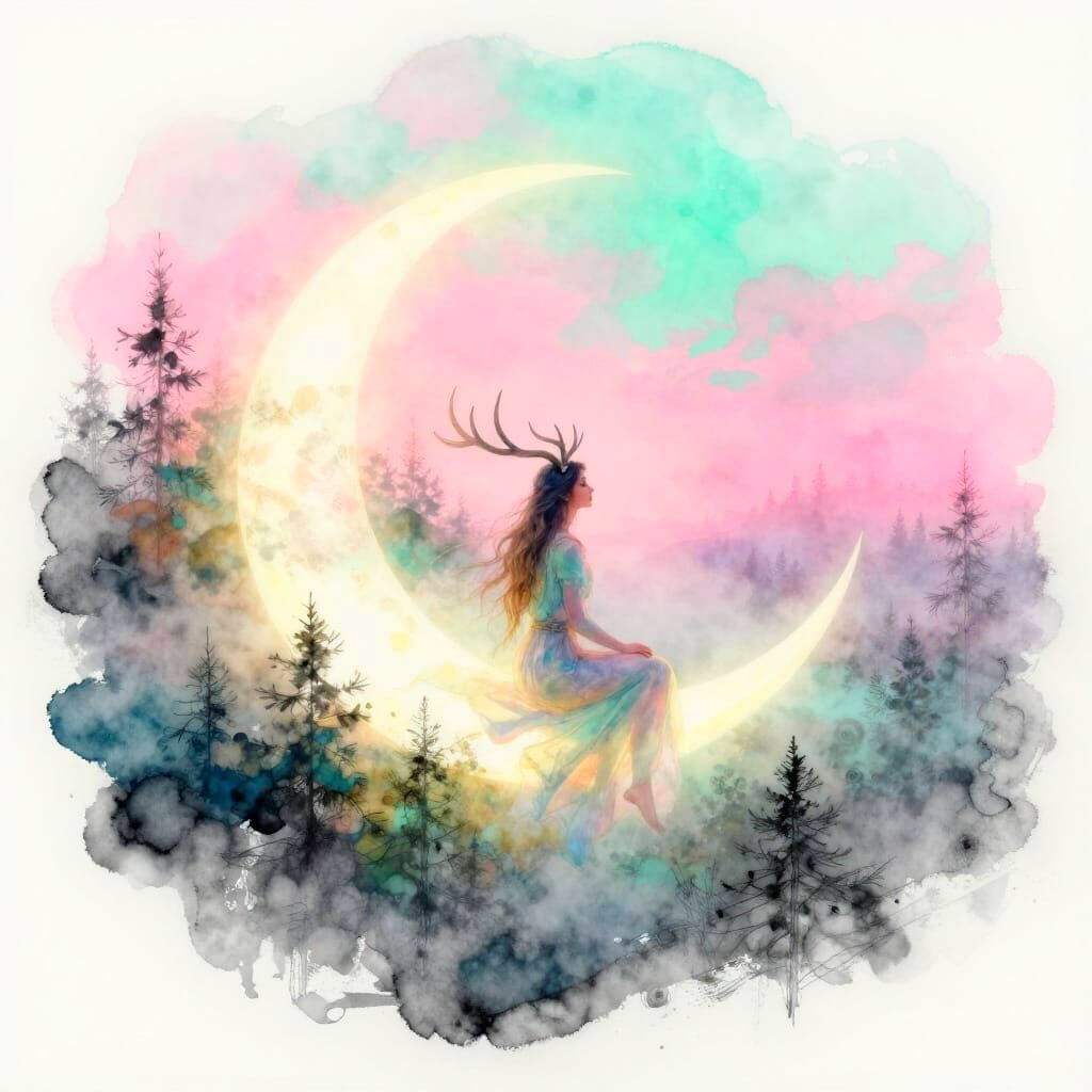 This fine art digital painting captures a surreal dreamscape with a mystical antlered figure on a moonlit crescent above a foggy forest, bathed in a soft, ethereal glow.