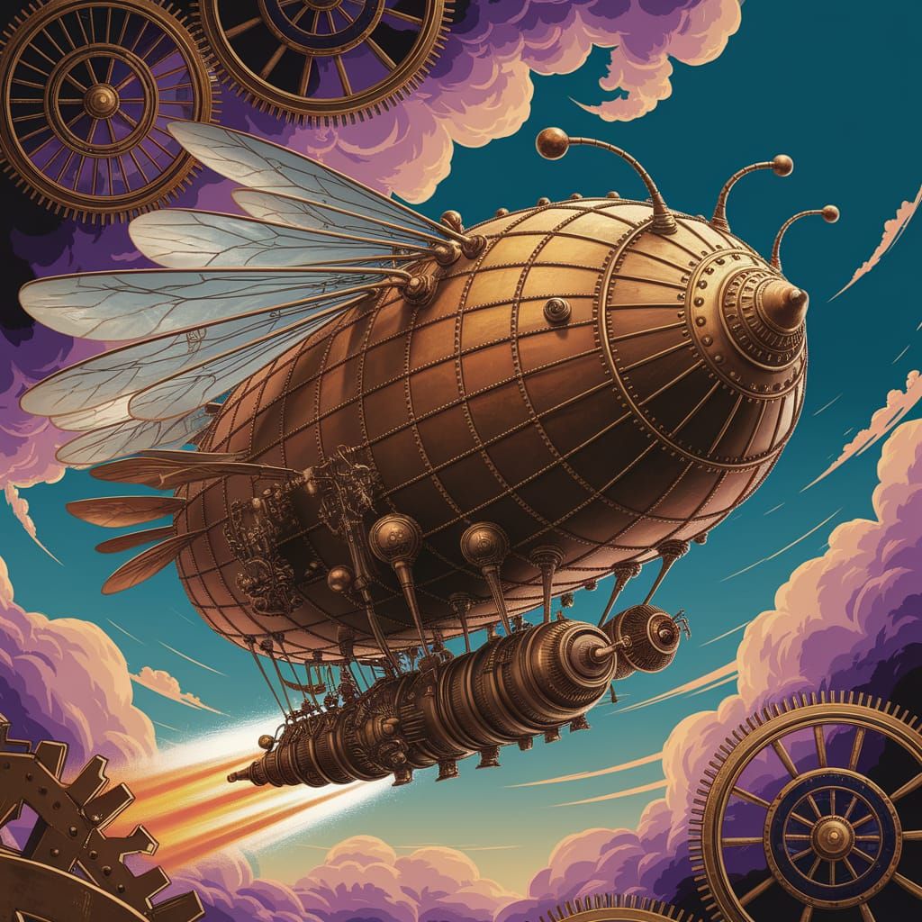A striking picture of a giant steampunk bumblebee airship sailing through a clockwork sky. The image is rendered as a detailed matte painting with rich colors and fantastical elements.