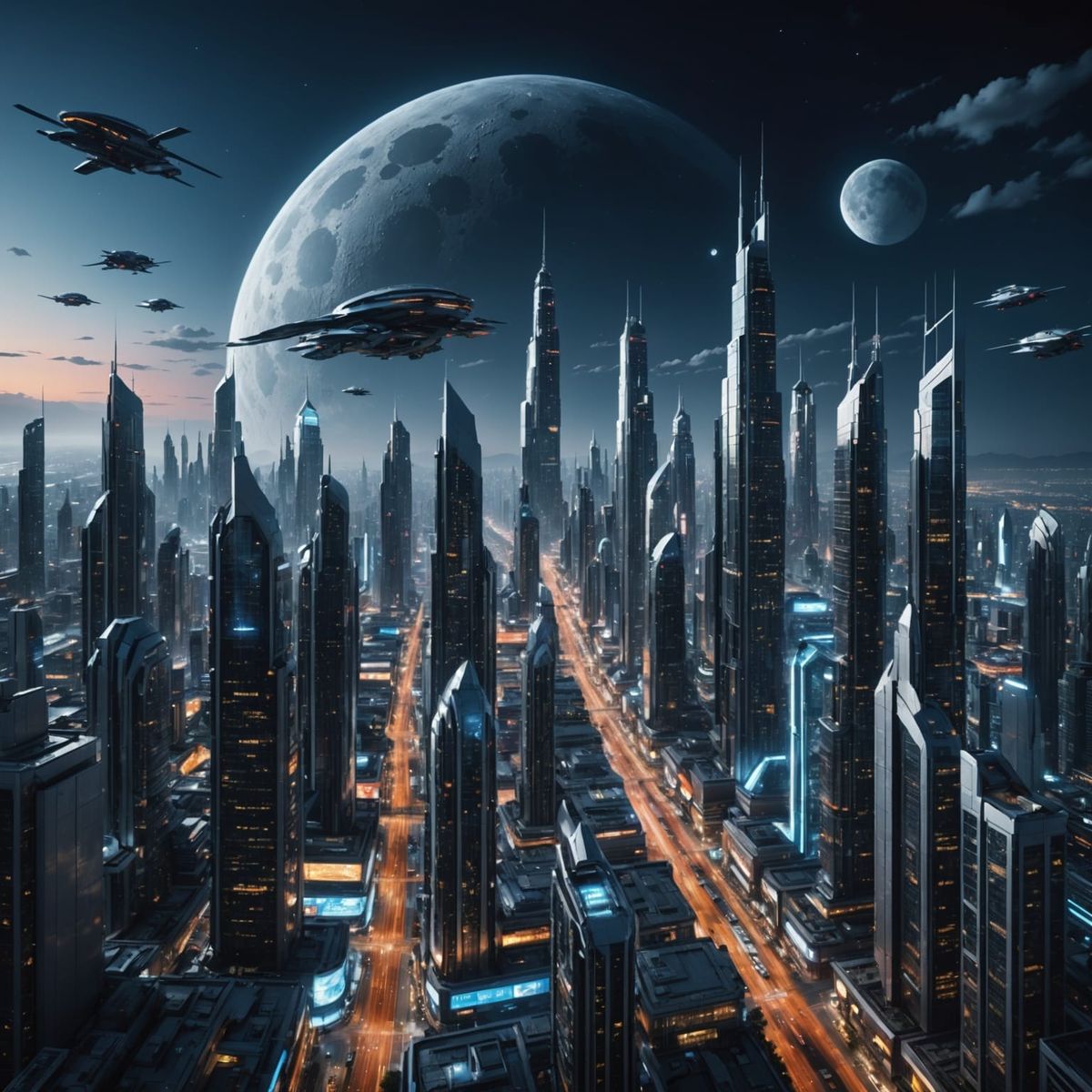 This ultra-realistic image depicts a futuristic Earth city at night, featuring glowing skyscrapers, flying cars, and neon lights under a clear sky with a large moon.