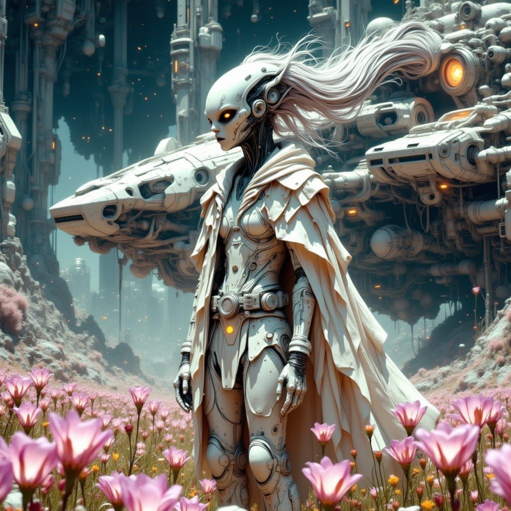 A striking picture of a tall, muscular alien male with large grey eyes, standing in a flower meadow next to a spaceship. The image has a hyperrealistic and cinematic feel.