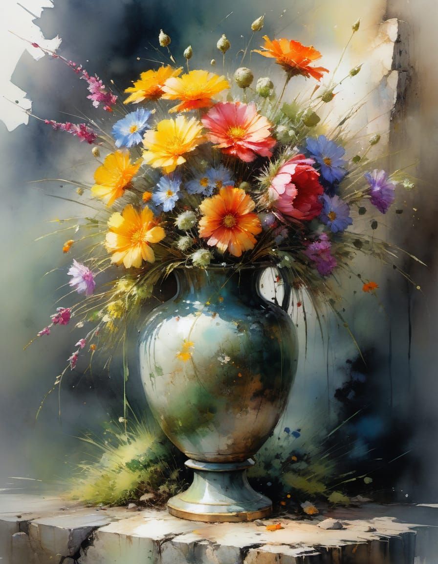 A stunning watercolor painting of a rustic copper vase filled with colorful flowers, set against a moss-covered stone ledge. The artwork features rough paint strokes and textures, capturing a sense of fine art drama and beauty.