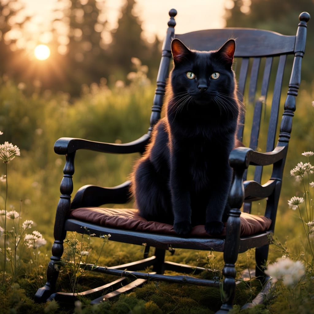 This image shows a black cat sitting on a vintage rocking chair amidst wildflowers and moss on a floating island. The scene, bathed in golden light, features fireflies and a surreal, dreamy atmosphere.