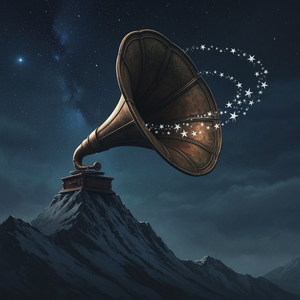 This image depicts a giant, ancient gramophone horn on a mountain summit, emitting cosmic sounds into a starry void. Ethereal creatures dance around the opening in a dark fantasy style with dramatic lighting.