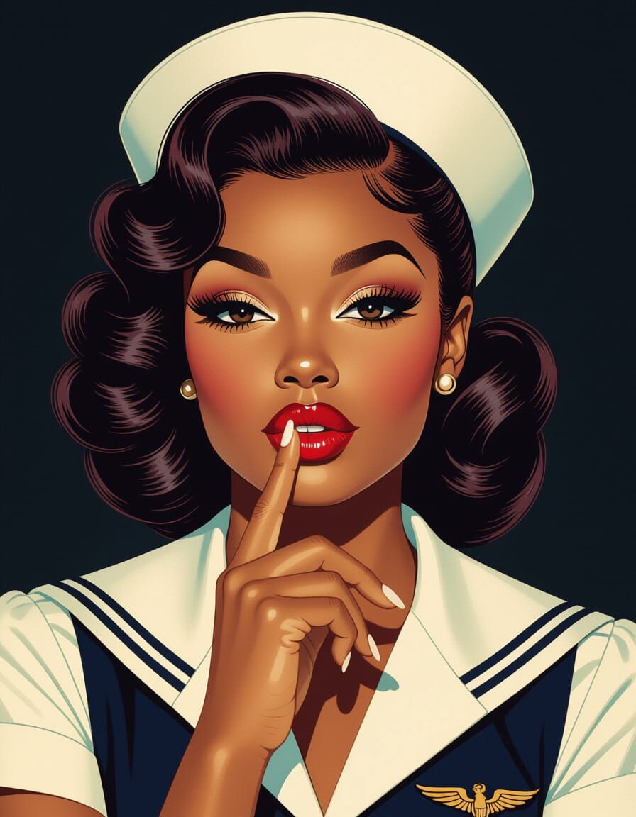 A striking picture of an African American pin-up girl in vintage 50's style. The artwork features classic pin-up makeup, a sailor dress, and a finger to her lips in a superrealistic Vargas style.