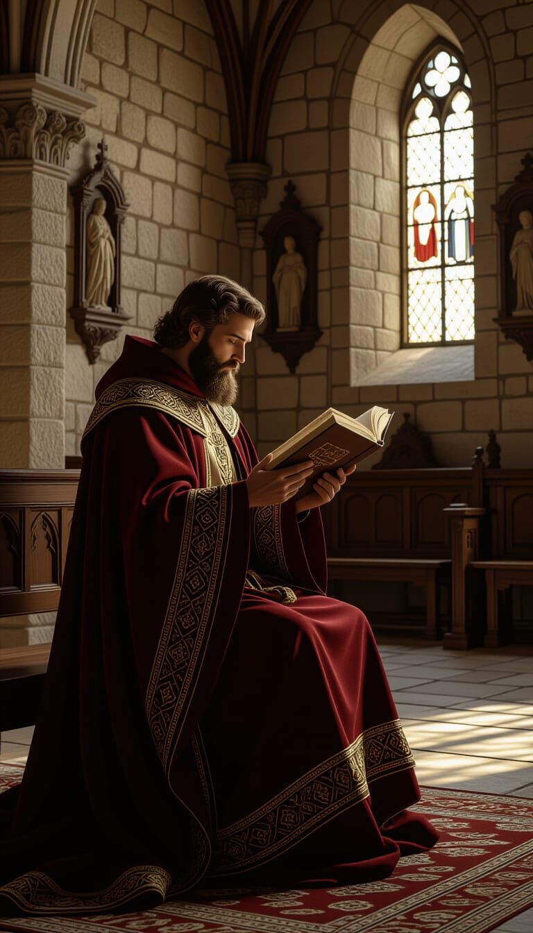 This image depicts Saint Cyprian engrossed in study within an old church, illuminated by soft lighting. The scene, reminiscent of classic paintings, features realistic textures and religious symbolism.