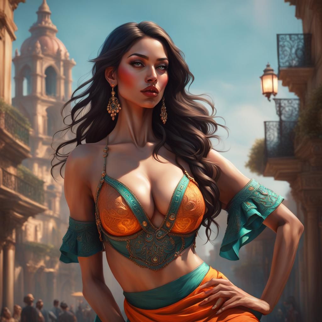 This image shows a beautiful Flamenco dancer in Barcelona. The artwork features dynamic lighting, intricate details, and a vibrant color palette, reminiscent of Art Nouveau and digital art.