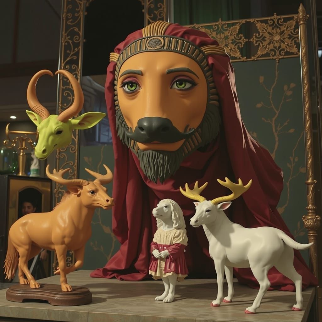 This image showcases a hyperrealistic sculpture bathed in intense, dynamic lighting. The sculpture features intricate textures and is illuminated with vivid red, green, yellow, black, and white.