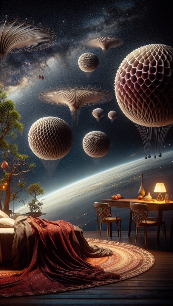 A serene dream sequence where everyone is comfortably sleeping in the earth, envisioned as a mothership, soaring through the darkness of the night sky. The destination is a witch's house, styled in a dark, complex and elaborately decorated manner resembling froufroucore aesthetics. In this setting, the ...