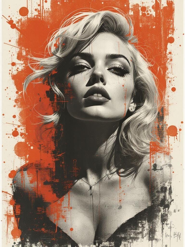 A full-body image of a confident blonde pin-up woman from the 1950s. The image is rendered with coarse paper texture, ink bleed, and muted contrast to emulate vintage newspaper printing.