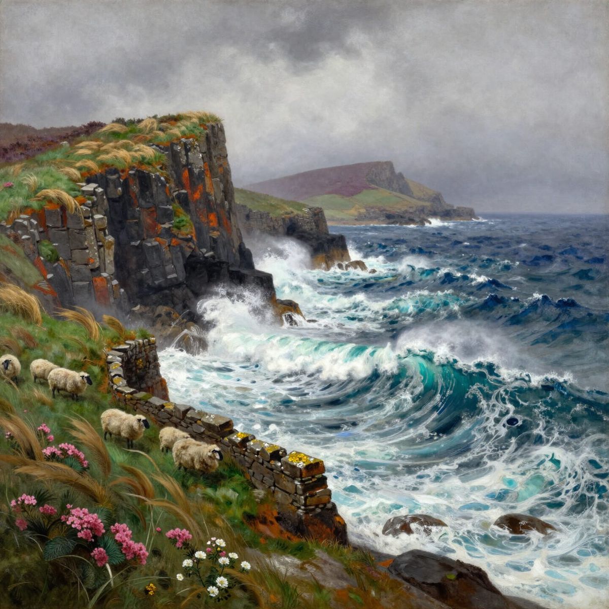 This image captures a wild Scottish headland battered by a powerful spring gale, in the style of dramatic Romantic marine paintings. Rugged basalt cliffs meet the churning sea in a sublime natural spectacle.