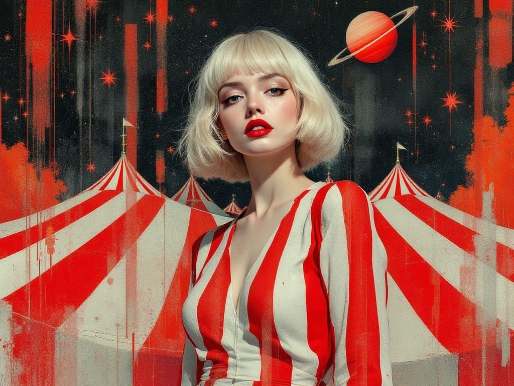 This striking image blends Renaissance grandeur with digital glitch art, featuring a woman with a bold red and white striped outfit against a vibrant, striped background, as if she's standing within a corrupted fresco.