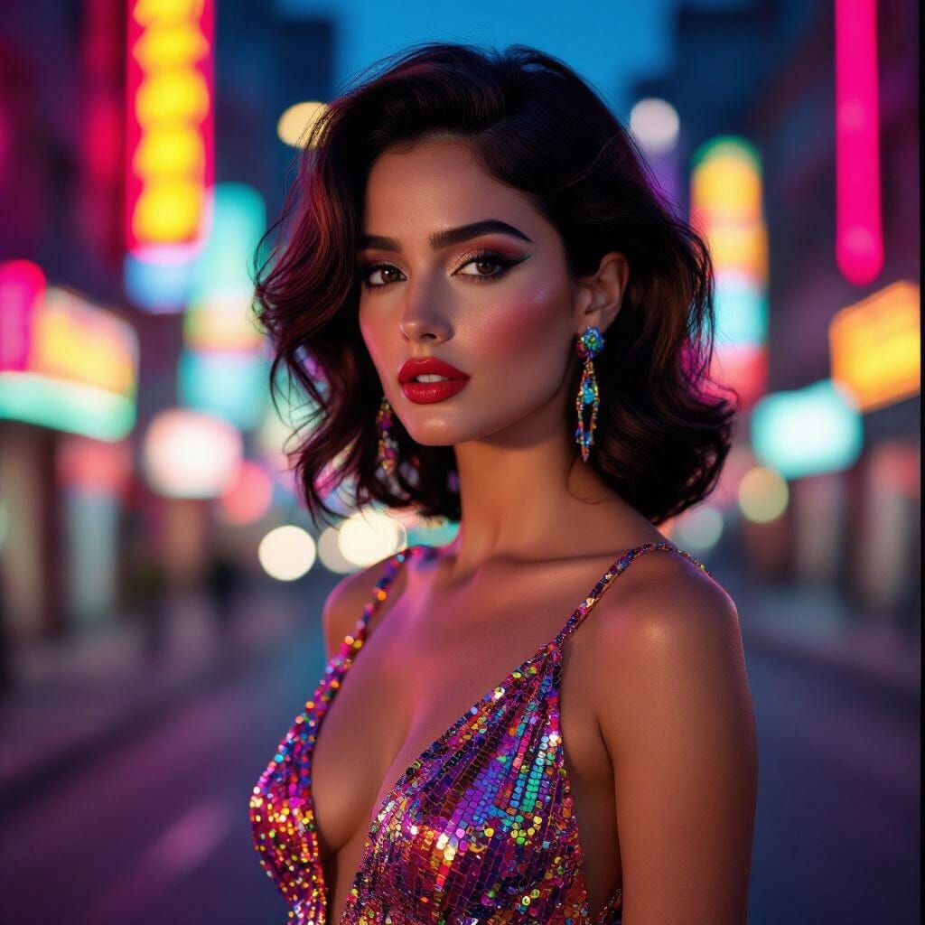 A striking, high-fashion image of Ana de Armas in vibrant 80s attire. Features dramatic neon lighting and a glamorous cocktail dress, captured with cinematic depth and shallow focus.