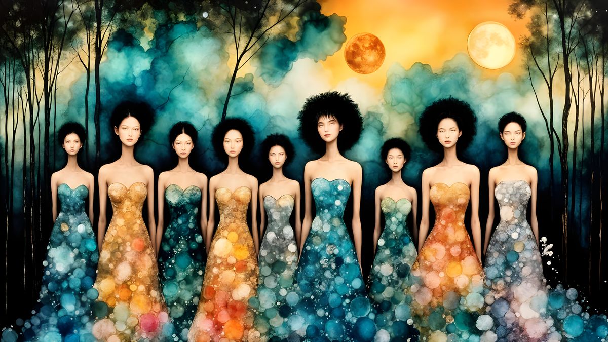 This image shows a coven of nature witches gathered in a misty forest under the moonlight. The artwork is rendered in an encaustic painting style with alcohol inks on black paper, evoking a mystical atmosphere.