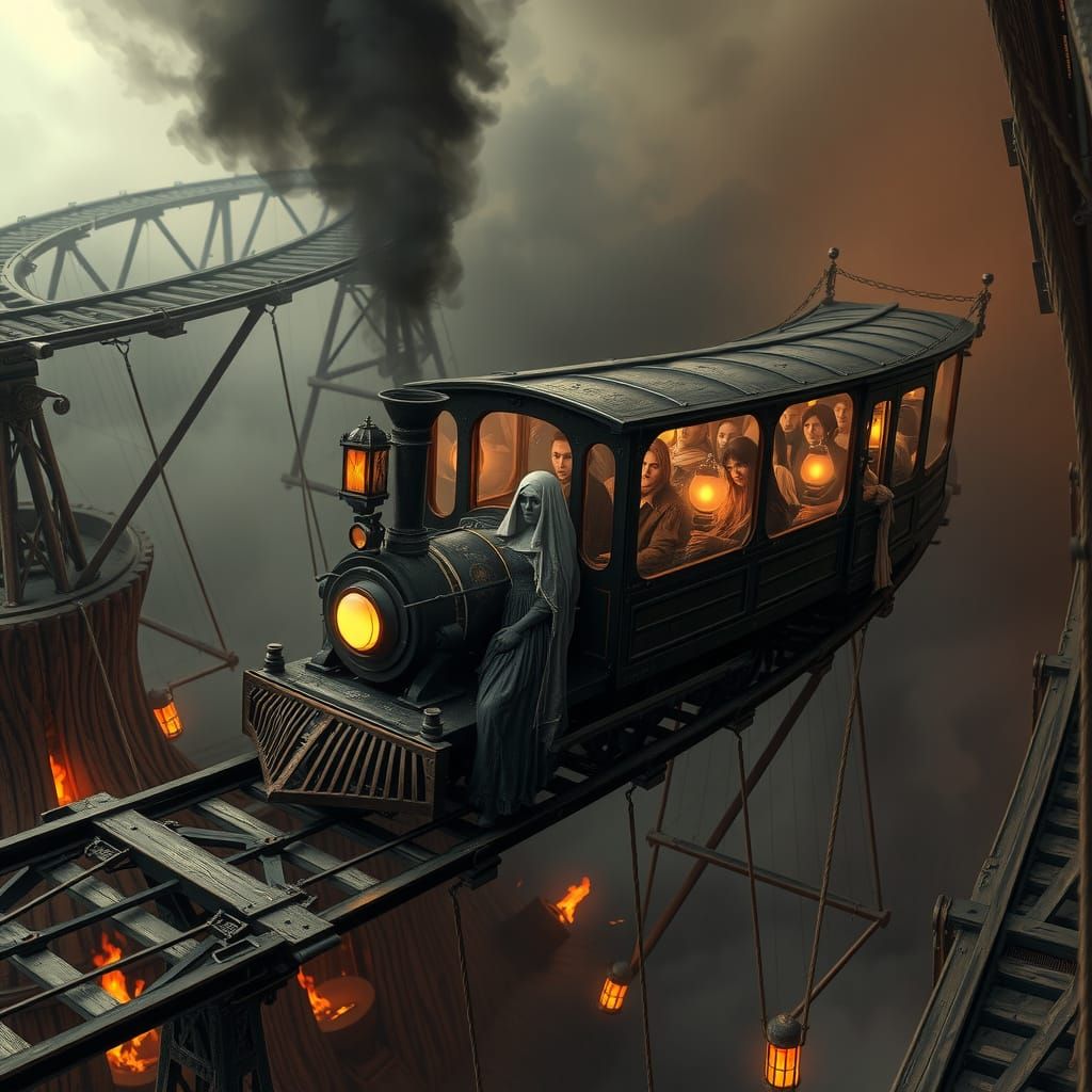 A haunting image of a steam-powered funfair ghost train suspended high above a deep, fiery ravine, its wraith-like passengers shrouded in tattered Victorian attire, amidst a swirling, smoggy atmosphere with intricate industrial details and eerie ambiance.