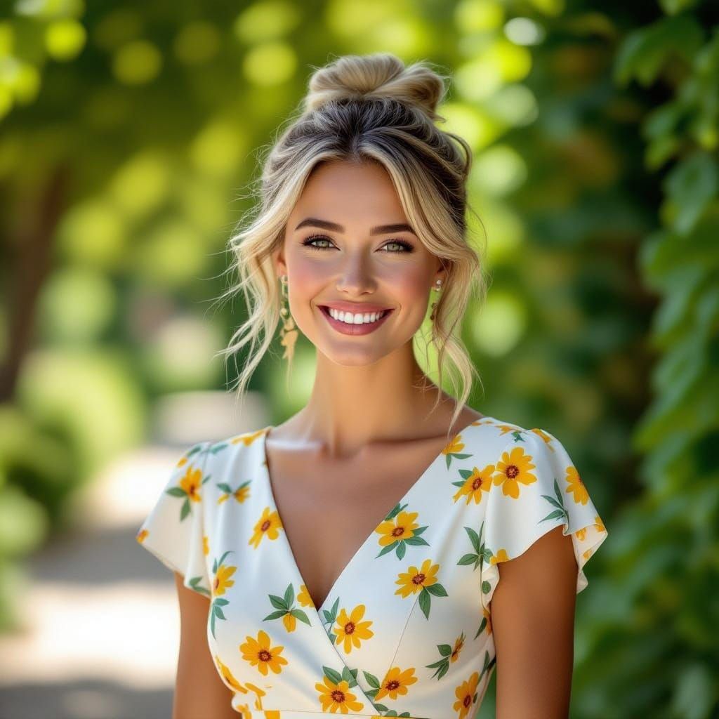 A portrait of a blonde woman with a warm smile walking through a sunlit garden. The image evokes an impressionistic style, with soft light and delicate details reminiscent of classic portraiture.