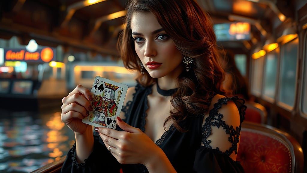 This image features a stunning woman card player in a black dress on a riverboat, revealing a card with her mirror image. Rendered in hyperrealistic, detailed concept art style with dramatic lighting and vibrant colors.