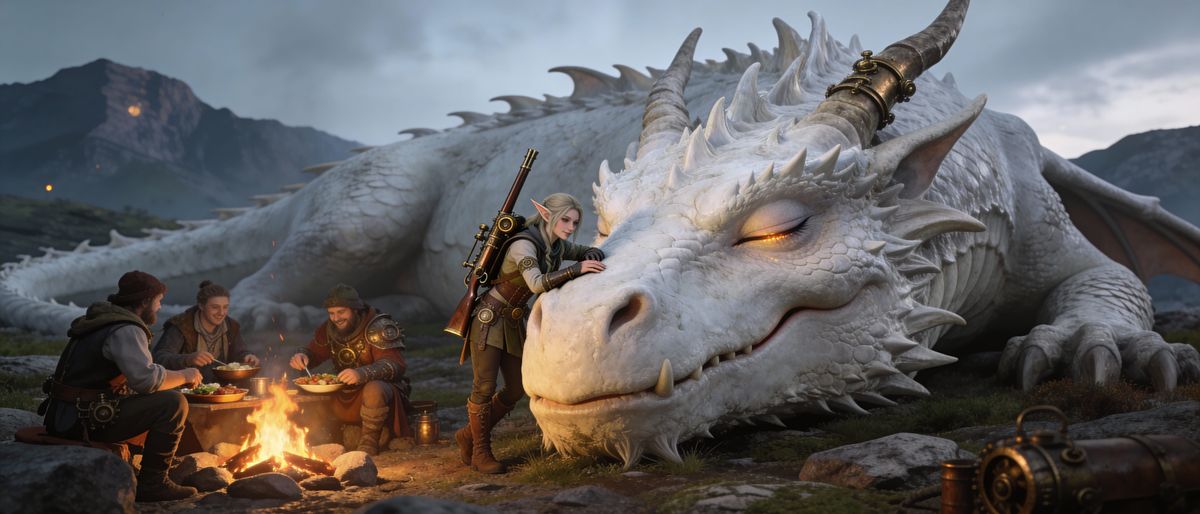 A photorealistic scene of a massive white dragon resting by a bonfire with happy adventurers. A female elf shares a moment with the dragon in a detailed, cinematic steampunk setting.