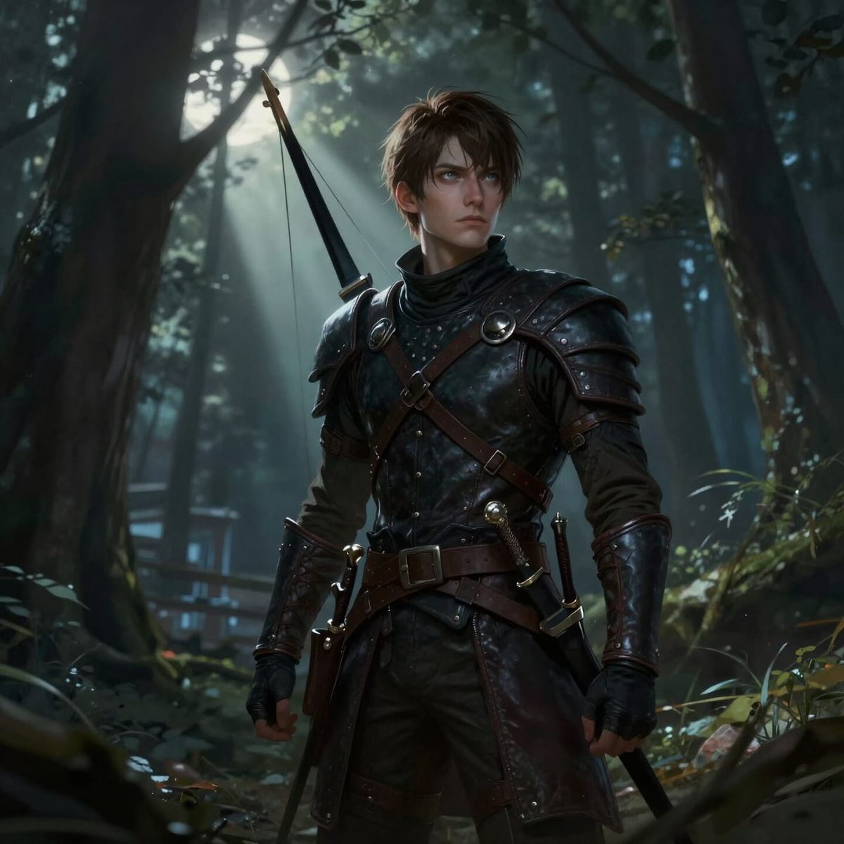 This image shows a stealthy ranger in dark leather armor, equipped with a longbow and daggers, standing in a moonlit forest at twilight. It features dramatic lighting and shadow play, evoking a sense of hidden power.