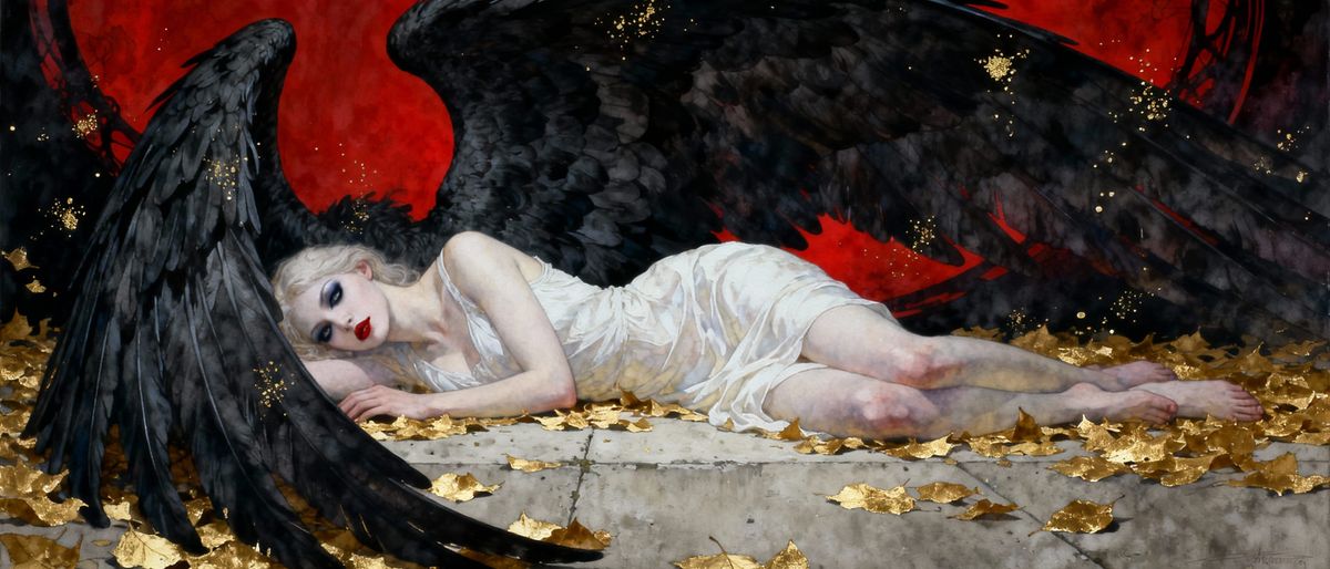 This image shows a fallen angel, a gorgeous woman with pale skin and striking makeup, lying on a gold-flecked ground. Immense black wings surround her, set against a dark, melancholic backdrop in an impressionistic oil painting style.