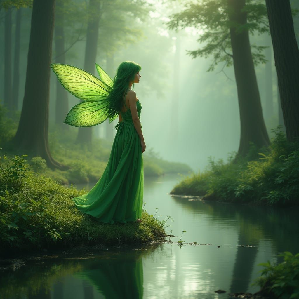A captivating image of a green-haired woman in a leafy dress gazing at her reflection in a stream. This hyperrealistic artwork features intricate details and soft lighting, in a nature-inspired style.