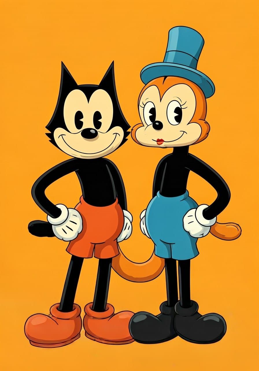 This image shows an animal couple in a playful pose, reminiscent of early Disney and Fleischer Studios cartoons. The style is vintage and whimsical, with bold lines and bright colors in a rubber hose aesthetic.
