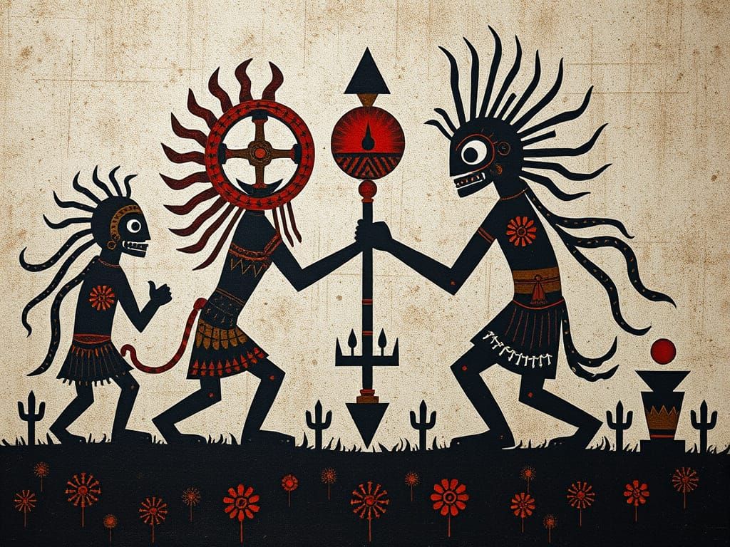 This image depicts tribal artwork symbolizing the eternal conflict between a utopian world of peace and a dystopian realm of darkness and misery. The style is primitivism.