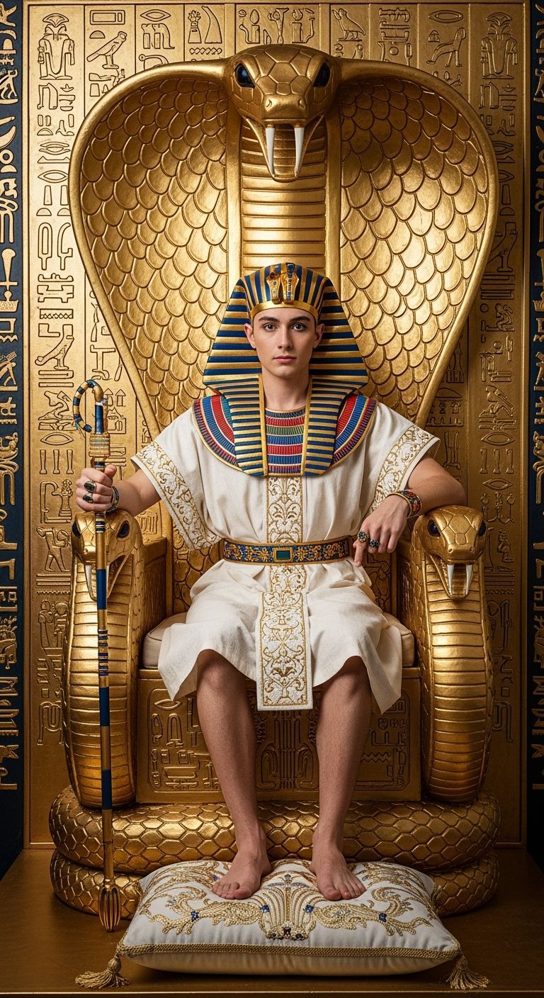 A striking picture of a youthful Egyptian Pharaoh seated on an ornate golden cobra throne. He wears traditional regal attire, complete with a cobra crown and jeweled scepter, photographed with natural lighting.