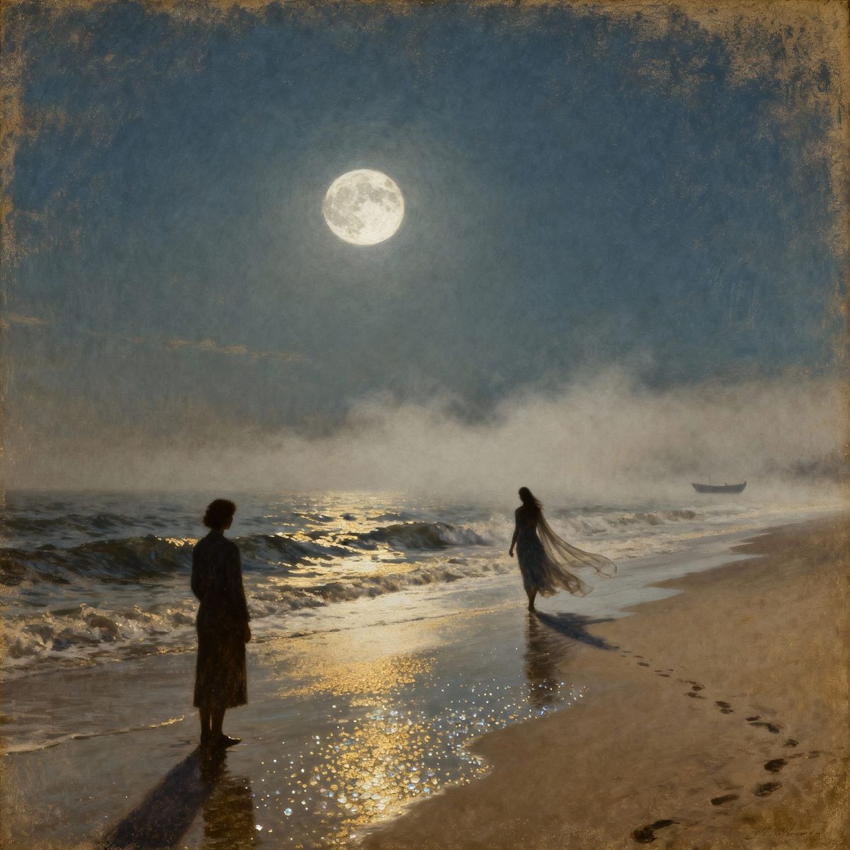 A vintage-style painting capturing a lonely beach at night under a full moon. Features shimmering waves, wet sand, and two figures in a poignant, cinematic scene with a sepia and muted blue palette.