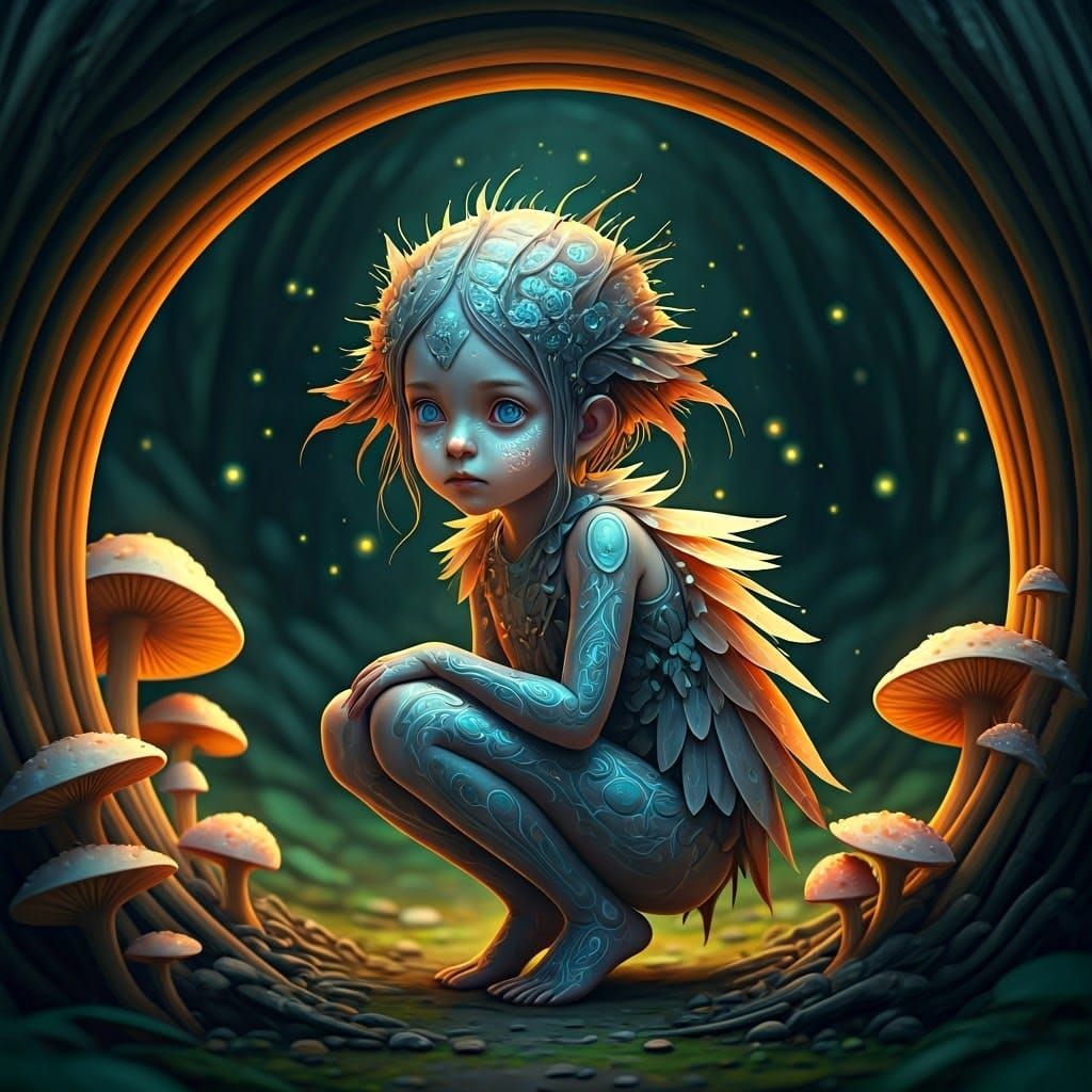 This image shows a girl with chitin patterns, crouched beneath mushrooms. Her eyes resemble dragonfly wings, and antennae twitch in her hair. She wears a dress made of petals, with bioluminescent gnats swirling around her head.