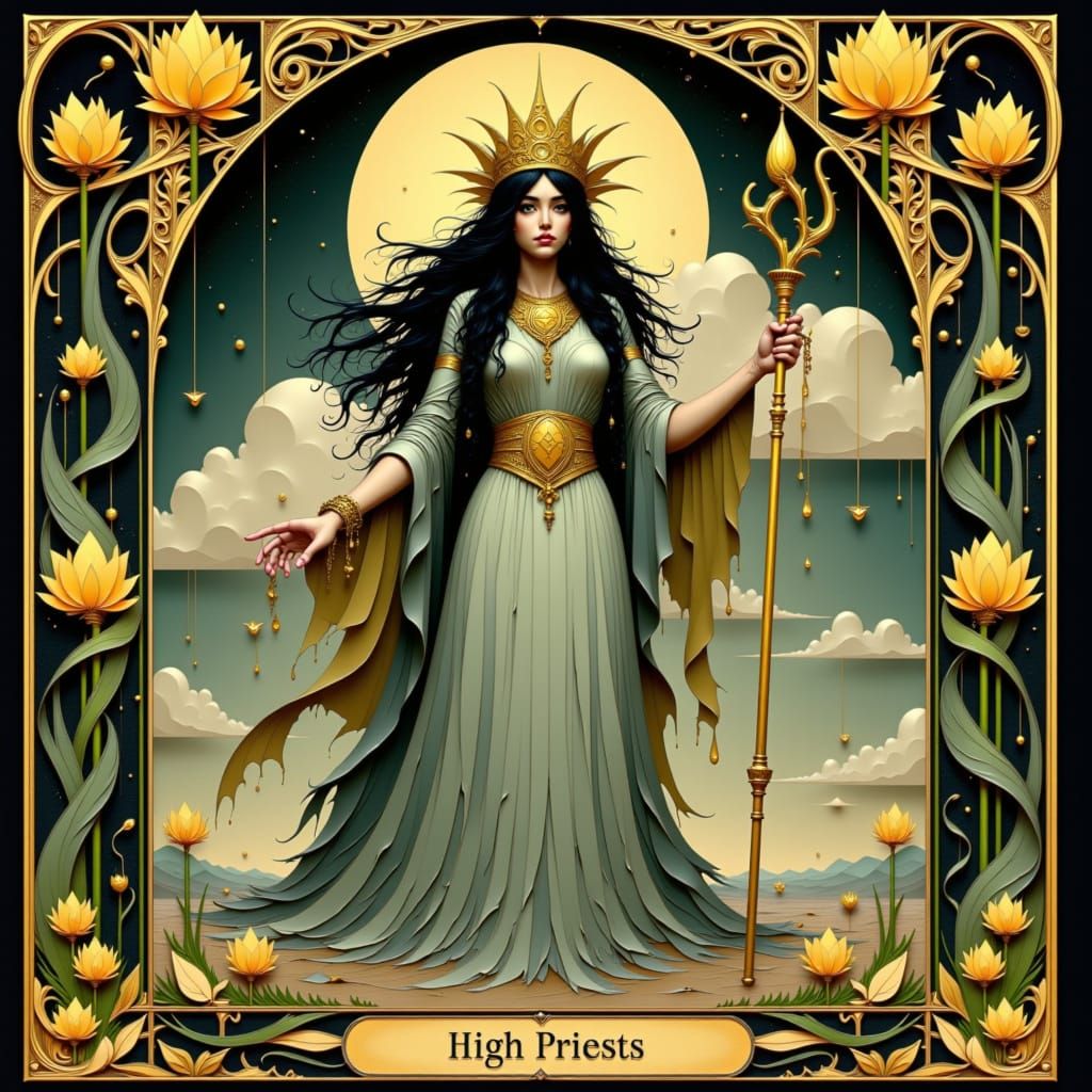 This image shows the High Priestess tarot card, featuring the central figure holding a spirit staff. The frame incorporates flowing, organic lines in an art nouveau aesthetic, reminiscent of vintage poster art.